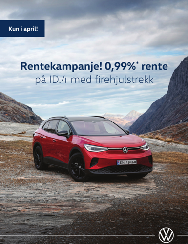 Gjelder forbrukerkjøp. Tilbudet gjelder ID.4 Pro 4MOTION Exclusive. Kampanjen gjelder til og med 30.04.2026, kan ikke kombineres med andre kampanjetilbud. WLTP-rekkevidde: 546 km. Strømforbruk ved blandet kjøring: 16,8–17,1 kWh/100 km. CO₂-utslipp ved blandet kjøring: 0 g/km. Eff. rente 2,38% ved lånebehov kr 250 000 o/5år, etableringsgebyr kr 3 123. Totalpris kr 266 661. Forutsetter 35% egenkapital og finansiering i Volkswagen Financial Services. Flytende kampanjerente i de tre første årene (p.t. 0,99% som deretter justeres til gjeldende produktrente p.t. 8,15%). Både kampanje- og produktrente er flytende og kan endres frem til utleveringsdato, samt at den følger normal renteutvikling i hele låneperioden. Pris gjelder levert Oslo inkl. frakt og leveringsomkostninger.